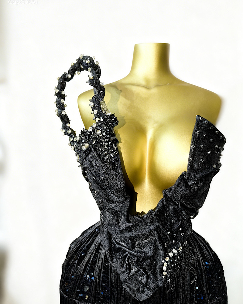 Think confident, tailored, and intentional something you’d wear to an important black tie event, Art gallery opening, or elevated dinner. The structure creates presence; the clean drape lines create sophistication top
